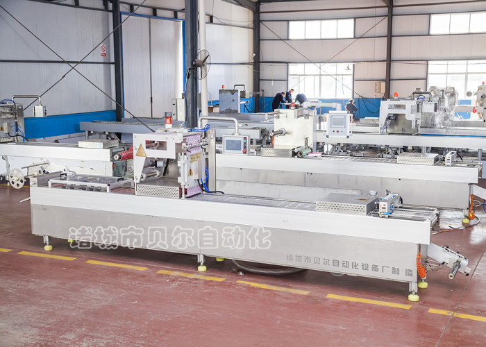 一、產品簡介 拉伸式全自動真空包裝機(拉伸膜包裝機圖片如圖)是我廠2000年自主開發的新產品,經過十六年的研發與完善,貝爾拉伸膜包裝機以其成熟技術,高端原裝進口主機配件,高效使用性能,。 貝爾全自動拉伸膜包裝機能夠自動制袋,自動打印生產日期及批號,自動真空包裝,真正實現自動化包裝,包裝袋應用規格廣泛,長度范圍:60-460mm,寬度范圍:60-600mm,包裝效率每小時1000-15000袋,通過更換不同的上料系統,可以對液體,膏體,粉末,塊狀等不同的物料進行自動定量包裝,實現一機多用,高效智能,產品主要規格有LZ320型,LZ420型,LZ520型,同時可根據客戶產品規格量身定制設備,以達到提升產能,避免物料浪費,節約生產成本的目的。 二、應用范圍 適用于熟食、果蔬、海產品、冷凍塊肉、豆制品、中藥材、五金、電子元件、械,日化用品等物品的真空包裝或充氣全自動拉伸熱封包裝。該系列包裝機除隨機配備的模具外,可以根據用戶不同產品需要設計訂做模具,亦或在同一臺機器上進行拉伸膜包裝和托盤包裝。 三、性能特點及原理